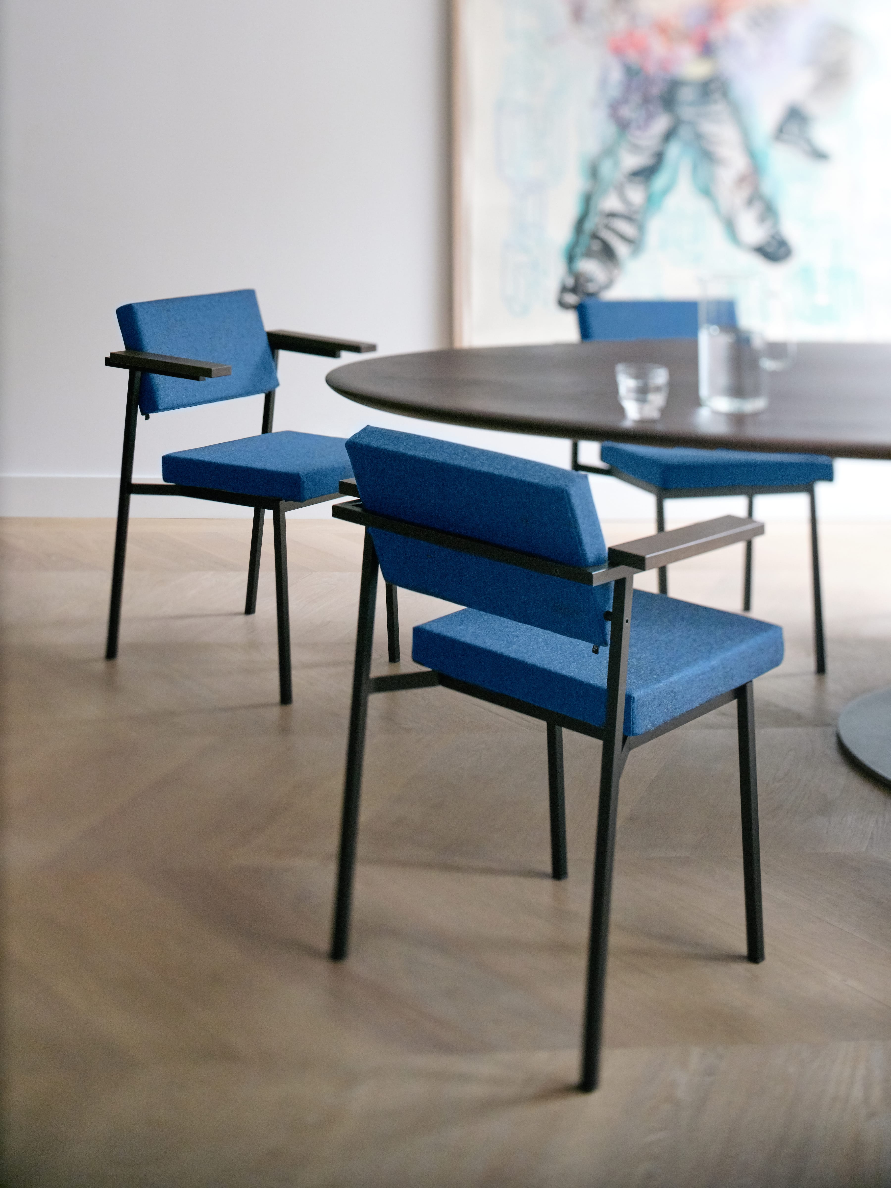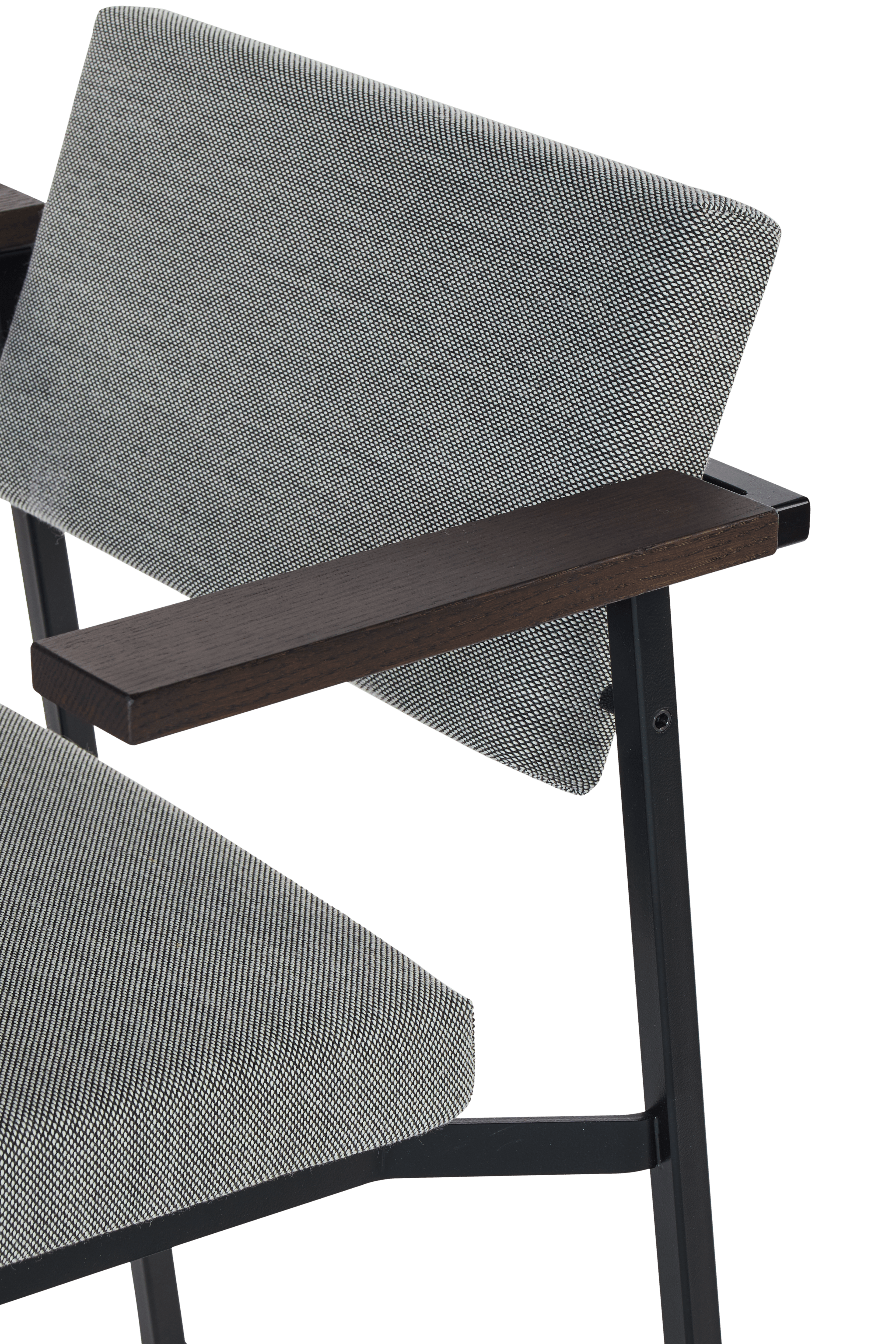 - Material descriptionFrame: square tubular steel with black powder-coat finish // Armrests: solid oak (natural or dark brown) or walnut